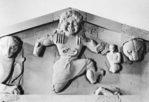 The central figure, enlarged in scale to fill the triangular shape of the pediment, aggressively lunging towards us, is Medusa, undercut as to be almost three-dimensional.