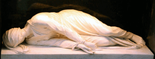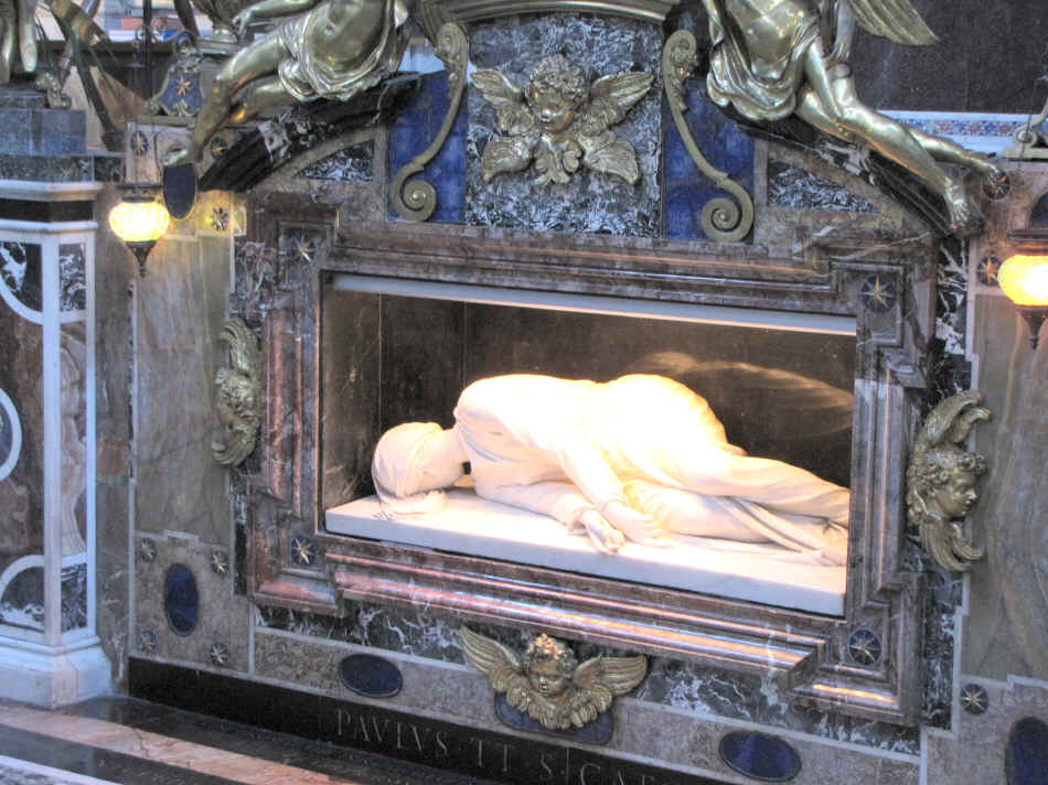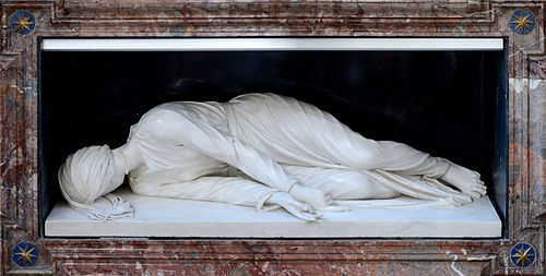 Cecilia lay, as originally placed, on a marble slab, preserved, pure and without decay. She was face down, a veil covering her head, and a ribbon over her severed neck.