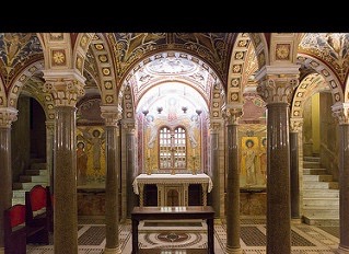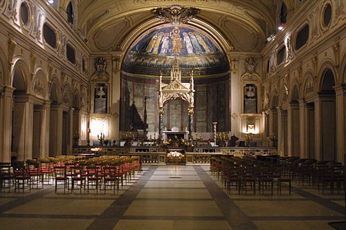 It was believed that the 3rd c. martyred saint, Cecilia, whose name was given to the church, was buried beneath the altar, having been moved there in 822 from the Catacombs of St. Callistus on the Via Appia, by Pope Paschal I, along with those of her husband, Valerianus.
