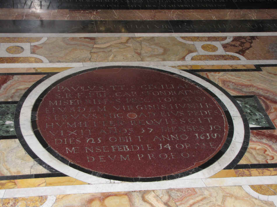 The 1559 Cardinal Sfondrato, at the time of another restoration, had the high altar examined and issued an order that IF Cecilia’s relics were discovered, she would be reinterred in a proper coffin at the altar of the church that bears her name – this Church of Santa Cecilia in Trastevere (over the Tiber).