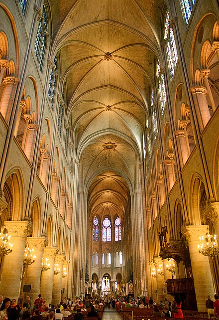 The cathedral design employed “sexpartite” rib vaults. There were two pairs of 6 vaults that corresponded to each bay. And the bungled columns separating the bays sent a transverse arch to distinguish the bay on the ceiling. You can see the thicker “rib” of the transverse arch here, separating the pairs of sexpartite vaults. This was a common pattern for the ceilings of Gothic cathedrals, although you occasionally saw Quadripartite and Septpartite.