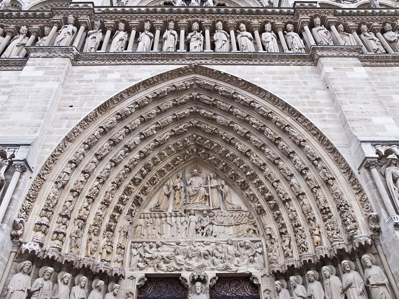 The twenty-eight statues are the Kings and Queens of Judah. These are replacements. The originals were destroyed in the 1789 French Revolution by an uneducated mob who thought that they represented the Kings and Queens of France. In 1843 renovations began to restore them. Fragments of the original figures are in the Museè de Cluny.