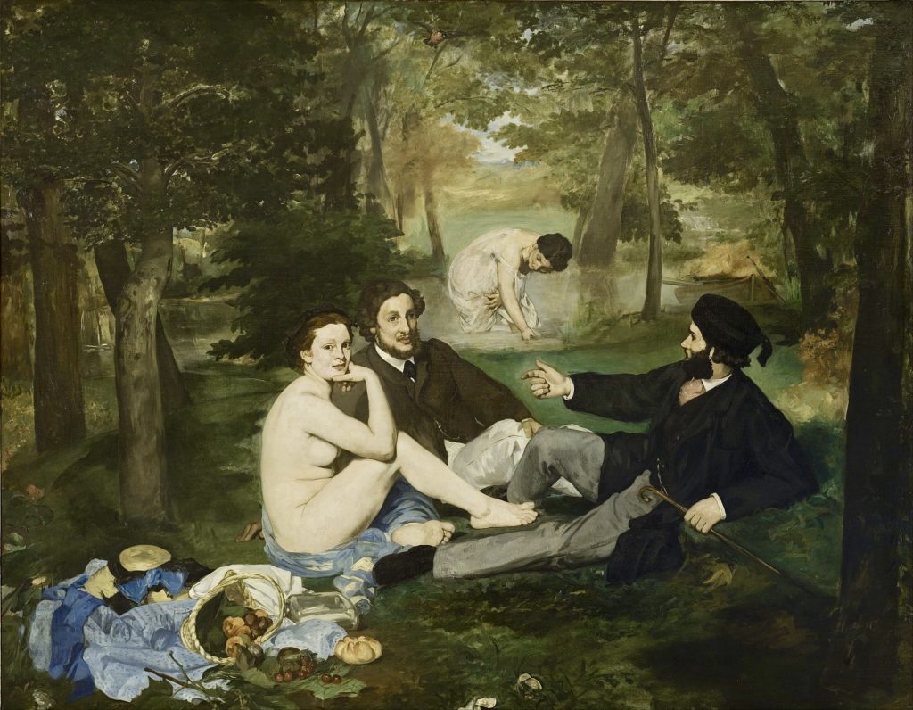 The painting is Le Dejeuner sur l’Herbe, or Luncheon on the Grass. It was painted in 1863 by Edouard Manet (1832-1883). It is an oil painting, 7’x8’10”.
