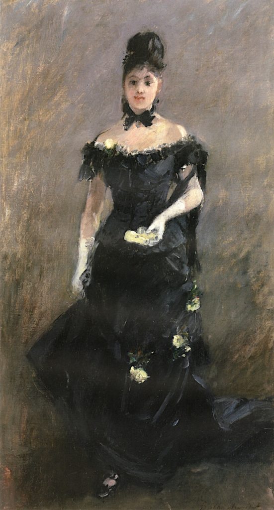 “Berthe Morisot with a Bouquet of Violets“, 1872, 22×16, Musée d’Orsay, is one of seven paintings that her brother-in-law, Edouard Manet painted of her. His use of black (also seen in “Luncheon on the Grass”), was flat, demanding and controversial. In this painting Berthe is portrayed in a mourning dress after the death of her father. Later in her career, at a time when a black dress became the fashion (before Sargent’s “Madame X” or Chanel), she painted her own version of “Woman in Black” or “Before the Theatre”, 1875.